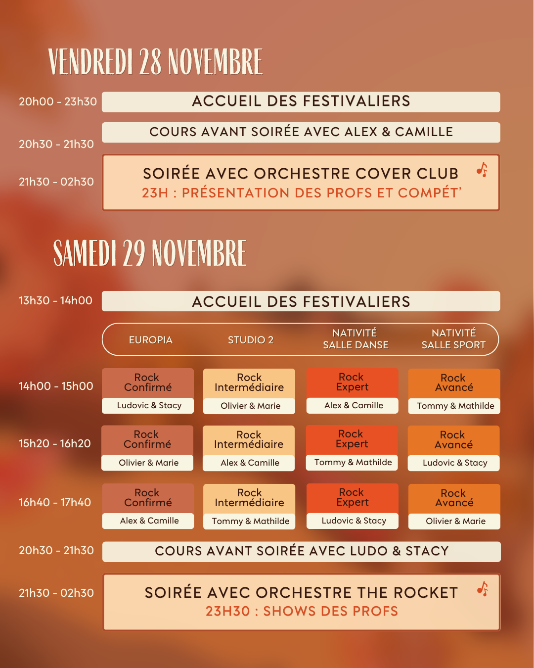 La compétition sera le vendredi soir pendant la soirée. Le programme exact sera défini selon le nombre de couples inscrits.